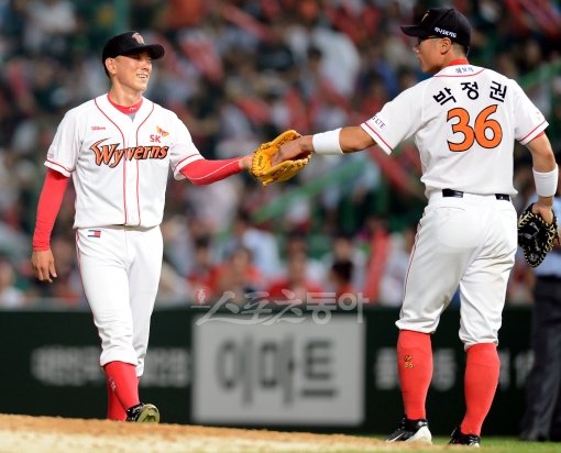 SK 1루수 박정권(오른쪽)이 13일 문학 두산전 7회초 무사 1루서 김동주의 플라이 타구를 잡은 뒤 선발 박정배에게 공을 건네며 격려하고 있다. 문학|김민성 기자 marineboy@donga.com 트위터 @bluemarine007