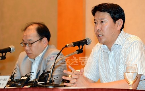 선수협 박충식 사무총장(오른쪽)이 13일 서울 마포구 서울가든호텔에서 열린 기자회견에서 올스타전 보이콧 방침 철회를 발표하고 있다. 왼쪽은 깊은 생각에 빠져있는 선수협 김선동 사무국장. 김민성 기자 marineboy@donga.com 트위터 bluemarine007