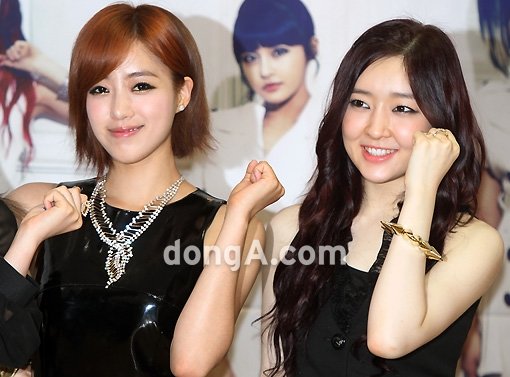 걸그룹 티아라 은정(왼쪽)과 아름이 14일 오후 서울 경희대 평화의전당에서 열린 티아라 팬클럽 QUEENS(퀸즈) 창단식 및‘Day by day’ 컴백 기자간담회에서 포토타임을 갖고 있다.