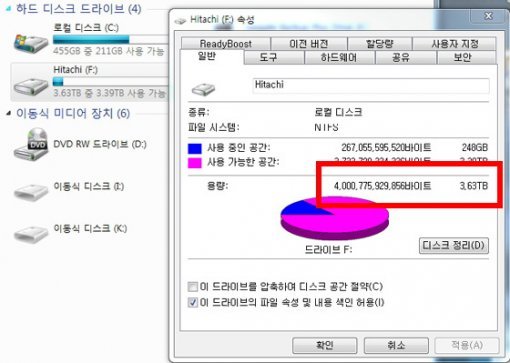 토로 데스크를 PC와 연결하면 [컴퓨터] 항목에 기본적으로 ‘Hitachi’라는 이름의 하드디스크 드라이브가 생성된다. 4TB라지만 실제 사용 가능한 공간은 약 3.63TB다. 일반적으로 하드디스크는 용량 표기 방식과 PC 인식 방식의 차이로 인해, 실제로 저장할 수 있는 공간이 약간 줄어든다. 그러니 3.63TB만 인식 되더라도 고장 난 게 아니니 당황하지 말길.