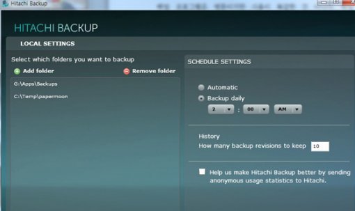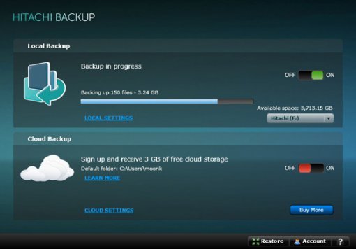 프로그램을 실행하면 ‘로컬 백업(Local Backup)’과 ‘클라우드 백업(Cloud Backup)’, 두 항목이 나오는데, 로컬 백업은 토로 데스크 등 PC에 연결된 하드디스크에 백업하는 기능이고, 클라우드 백업은 히타치가 제공하는 인터넷 저장소에 백업하는 기능이다. 히타치 홈페이지에 가입하면 3GB 용량을 무료로 사용할 수 있으며, 년 49달러(2012년 7월 기준 한화 약 56,000원)를 지불하면 250GB까지 사용할 수 있다(프리미엄 계정). 또한 프리미엄 계정으로 등록하면 애플 아이폰이나 아이패드의 히타치 앱(애플리케이션)을 통해 클라우드 백업 공간에 접속할 수 있다. 편리하긴 하겠다만, 250GB 사용에 월 5만원이라면 글쎄... 몇 십 GB를 무료로 주는 서비스도 많은데...