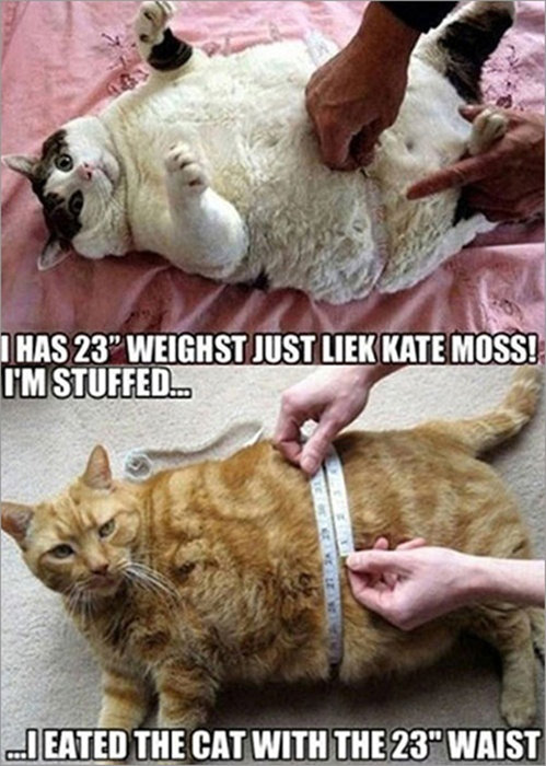 사진에는 살이 찐 고양이 두 마리의 허리를 재고 있는 모습을 담고 있다. 특히 “나는 23인치 허리를 가진 케이트 모스(모델)와 같아요”라는 문구는 웃음을 준다.