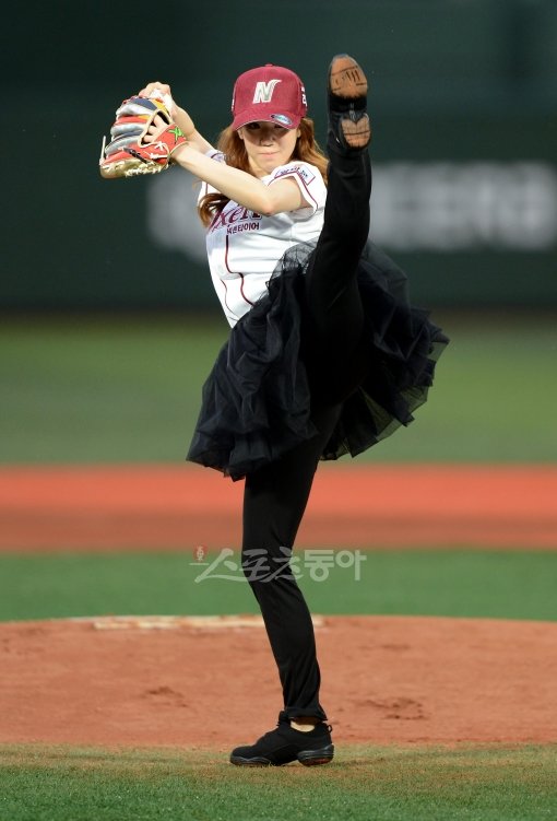 18일 오후 서울 목동야구장에서 '2012 팔도 프로야구' 넥센 히어로즈와 롯데 자이언츠의 경기가 열렸다. 넥센 시구자로 나선 발레리나 김리회가 시구를 던지고 있다.