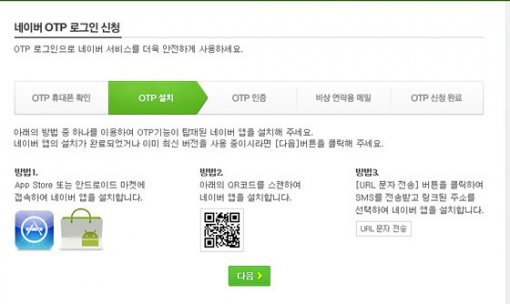 두 번째 단계는 OTP를 설치하는 단계이다. 서비스를 이용하기 위해서는 OTP 기능이 탑재된 네이버 앱이 필요하다. 앱스토어 또는 안드로이드 마켓에서 앱 내려받기, QR코드를 스캔하기, SMS를 통한 링크 전송 등의 방법으로 앱을 스마트폰에 내려 받는다.