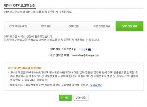 다섯 번째 단계를 끝으로 OTP 신청이 완료된다. OTP 사용 스마트폰 번호와 비상 연락용 메일을 확인한 후에 ‘확인’ 버튼을 누르면 모든 과정이 끝난다.