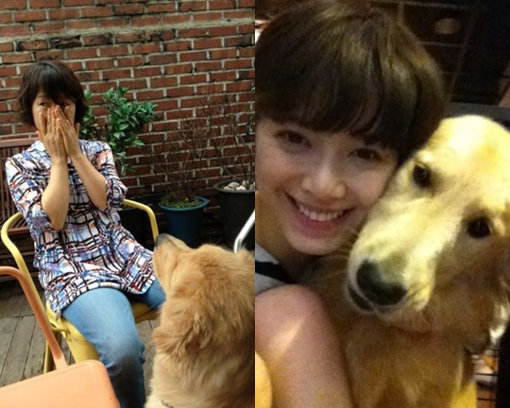 사진에는 앉아 있는 구혜선 엄마를 바라보는 애완견 감자의 모습이 담겨 있다. 그의 엄마는 얼굴을 가리고 있지만, 구혜선과 눈이 닮아 있어 시선을 끈다.