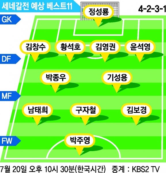 홍정호(제주)와 장현수(FC도쿄)가 부상으로 제외되면서 김영권(광저우 에버그란데)-황석호(히로시마 산프렌체)가 중앙 수비에 포진한다. 두 선수는 호흡을 맞춘 지 얼마 안 됐다. 14일 뉴질랜드와 평가전에서도 합격점을 받지 못했다. 세네갈을 상대로 안정된 수비를 보여 자신감을 끌어올릴 필요가 있다.