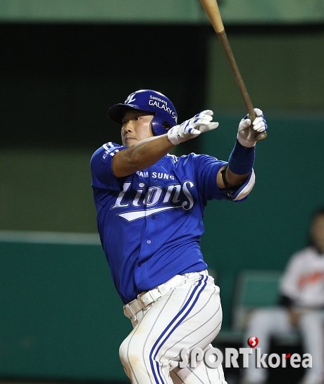 `2012 팔도 프로야구` 한화 이글스와 삼성 라이온즈의 경기가 19일 오후 대전 한밭 야구장에서 열렸다. 연장 10회초 1사 2루에서 삼성 이지영이 역전 2루타를 치고 있다.