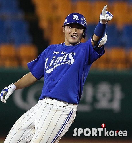 `2012 팔도 프로야구` 한화 이글스와 삼성 라이온즈의 경기가 19일 오후 대전 한밭 야구장에서 열렸다. 연장 10회초 1사 2루에서 삼성 이지영이 역전 2루타를 친 후 환호하고 있다.