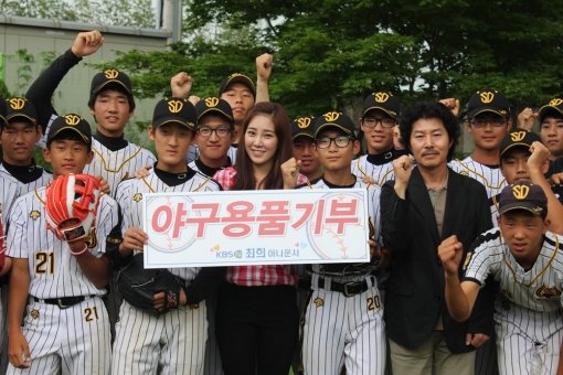 KBS N 아나운서 최희는 20일 오후 충주 성심학교를 방문, 충주 성심학교 야구부 선수들에게 개인 맞춤형 야구 글러브를 비롯한 각종 야구용품을 전달했다.