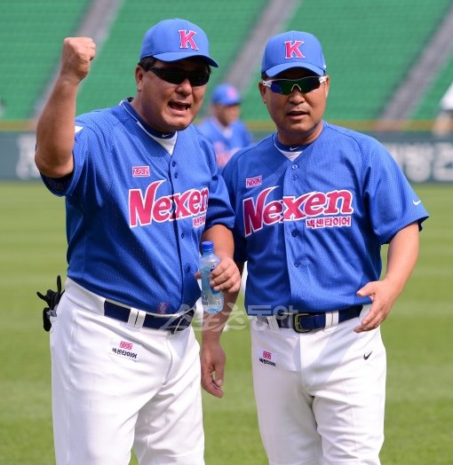 20일 서울 잠실야구장에서 열린 '넥센타이어 한-일 프로야구 레전드매치 2012' 경기 전 김성한 전 감독과 이만수 감독이 이야기를 나누다 카메라를 향해 화이팅을 외치고 있다.