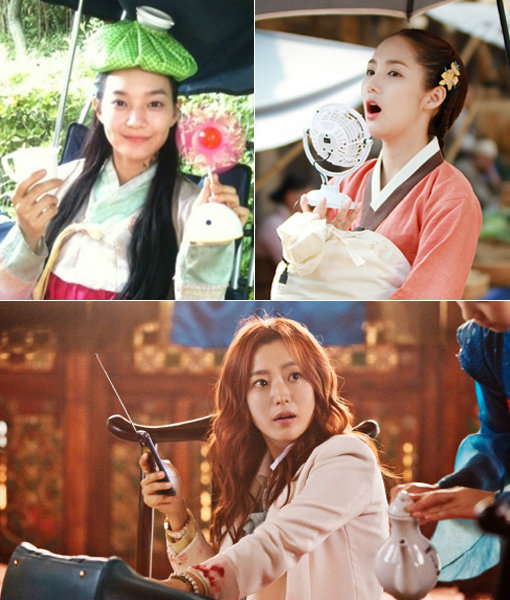 폭염 속에서 여러 겹의 한복을 입고 연기하는 여배우들. 이들은 저마다 ‘태양을 피하는 방법’을 터득하고 더위와 싸우고 있다. 신민아·박민영·김희선(맨 위 왼쪽부터 시계 방향으로). 사진제공|킹콩엔터테인먼트·힌지엔터테인먼트