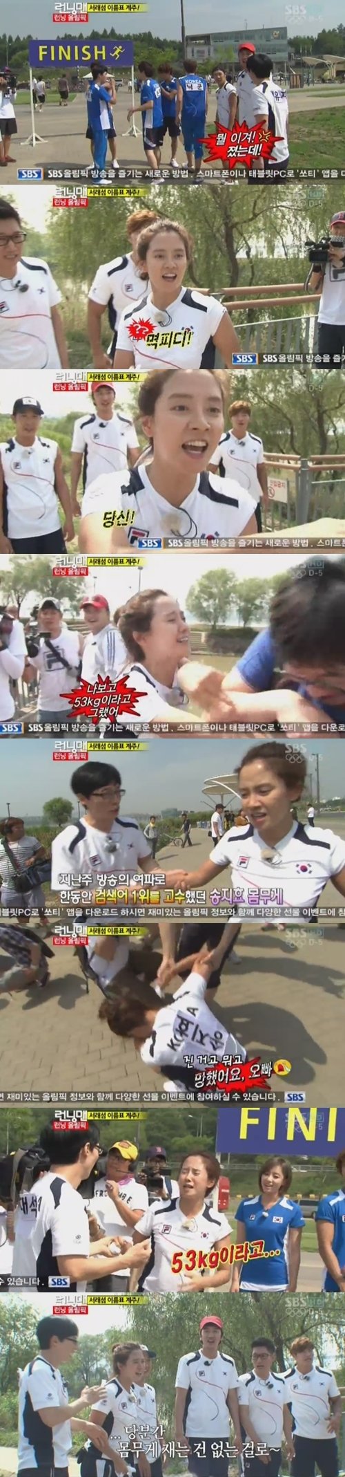 그런데 송지효는 계주를 마치고 화난 표정은 “멱!PD”라고 소리치며 멱 PD에게 다가왔다. 이어 송지효는 “멱PD 당신! 나보고 53kg이라고 했지! 진 거고 뭐고 난 망했다”며 울분을 토했다.