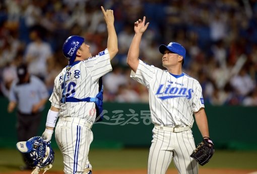 오승환(오른쪽)은 21일 대전구장에서 열린 프로야구 올스타전에서 세이브를 올리며 올스타전 개인통산 최다세이브(2개) 기록을 보유하게 됐다. 올스타전에서 경기를 마무리한 오승환이 진갑용과 함께 승리 세리머니를 펼치고 있다. 대전|김민성 기자