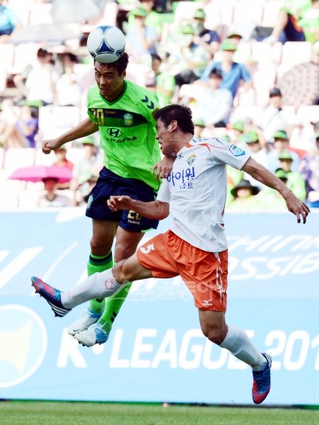 전북 이동국(왼쪽)이 22일 홈에서 열린 K리그 22라운드에서 강원 박우현에 앞서 공중 볼을 따내고 있다. 전주|김민성 기자 marineboy@donga.com 트위터 @bluemarine007