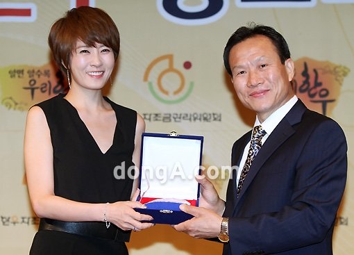 배우 김선아가 23일 오전 서울 중구 신라호텔에서 열린 ‘한우 홍보대사 위촉식’에서 강성기 한우자조금관리위원회 위원장과 포즈를 취하고 있다.