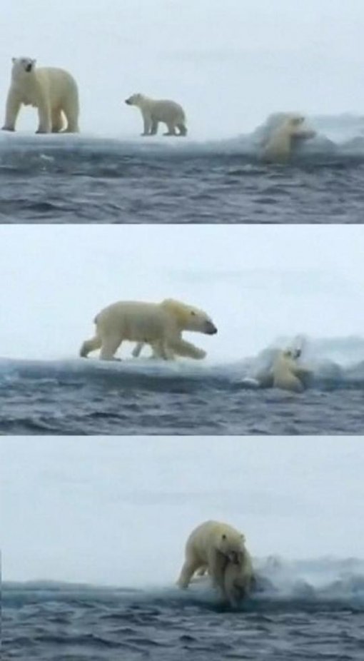 이때 어미 북극곰이 새끼곰의 엉덩이를 앞발로 당겨 무사히 구해낸다. 절로 탄성이 나올 만큼 감동적인 장면이다. 누리꾼들은 이를 보고 ‘아기곰 구하는 북극곰 영상’이라고 말하고 있다.
