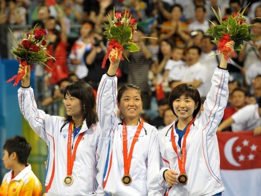 대한항공 여자탁구팀은 시드니, 아테네에 이어 베이징올림픽에서도 소속팀 선수가 메달을 따내는 쾌거를 이뤘다. 대한항공 소속의 김경아(맨 왼쪽)와 당예서(오른쪽)는 베이징올림픽 때 여자단체전 동메달을 이끌었다. 스포츠동아 DB
