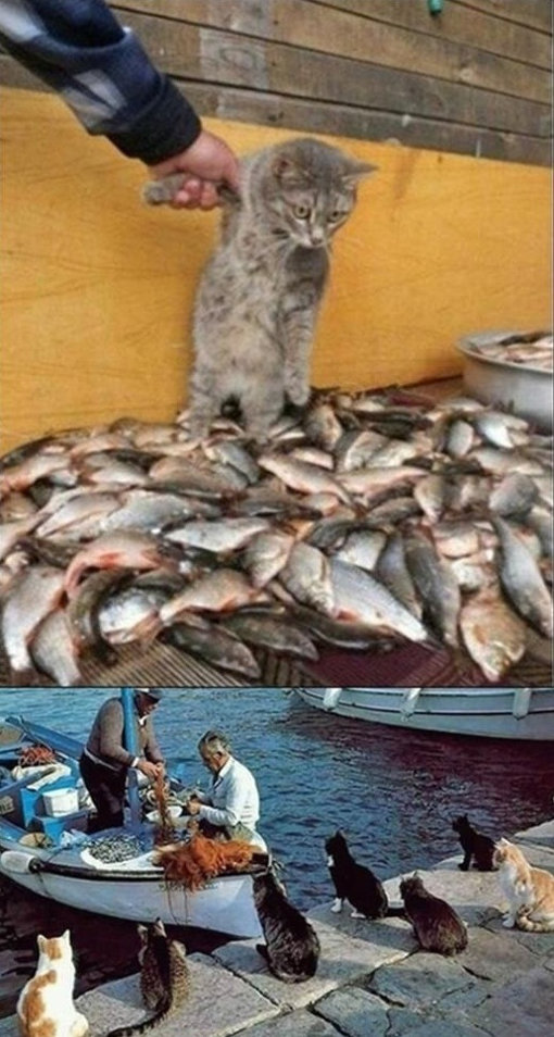영혼 빠져나간 고양이의 두 번째 사진은 낚시를 마치고 돌아온 어부 주위로 일곱 마리 고양이가 먹이를 기다리는 듯한 포즈로 있어 웃음을 유발한다.