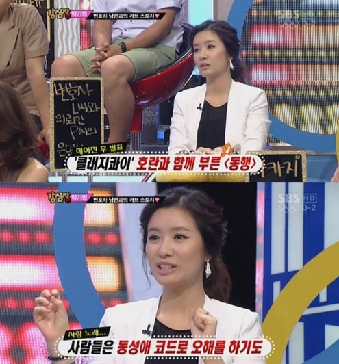 박기영은 24일 방송된 SBS ‘강심장’에서 변호사 남편과의 러브스토리를 공개하던 중 호란과 동성애 논란에 휩싸였던 황당한 사연을 털어놨다.