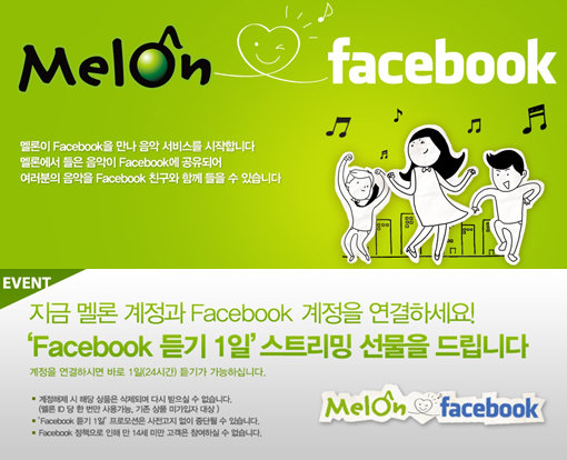 온라인 음원 사이트 멜론은 이용자가 페이스북 친구들과 서로 음악을 공유하고 감상하는 ‘페이스북 연동 서비스’를 제공한다.