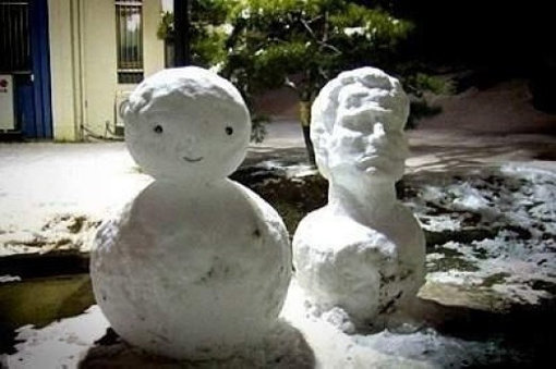 사진에는 두 개의 눈사람이 있다. 왼쪽에 있는 사진은 우리가 일반적으로 만드는 눈사람 모양이고 다른 하나는 조각상을 연상시키는 정교한 모습의 눈사람이어서 눈길을 끈다.