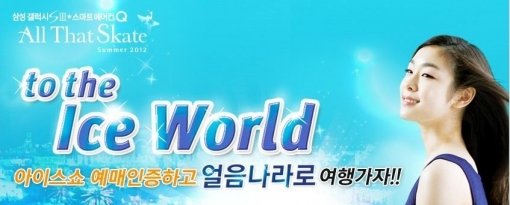 김연아의 매니지먼트사인 올댓스포츠는 26일 ‘삼성 갤럭시SⅢ★스마트에어컨Q 올댓스케이트 서머 2012’를 기념해 ‘아이스 쇼 예매 인증하고 얼음나라 여행 가자’ 이벤트를 26일부터 8월 23일까지 한 달 동안 진행한다고 밝혔다.