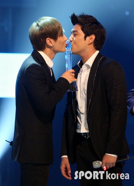 슈퍼주니어 이특과 강인(오른쪽)이 26일 오후 서울 상암동 CJ E&M 센터에서 열린 ‘Mnet 엠카운트다운(엠카)’에 트리플크라운을 달성한 뒤 트로피에 키스를 하고 있다.