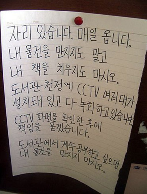 공개된 사진은 도서관의 한자리에 압정으로 고정한 경고문이다. 메모에는 “자리가 있으니 책을 치우지 말고 물건도 만지지 마라”는 글이 적혀있다.