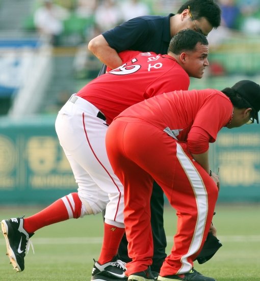 SK 마운드에 또 다시 비상경보가 발령됐다. 에이스 역할을 해온 마리오 산티아고(28·사진)의 부상 때문이다. 25일 대구 삼성전에 선발로 나선 마리오는 1회 이승엽의 땅볼 타구 때 베이스커버 플레이를 펼친 뒤 왼 무릎 통증을 호소했다. 결국 마리오는 세 타자만 상대한 채 마운드에서 내려왔다.