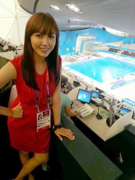 사진에서 김 아나운서는 붉은색 민소매 원피스 차림으로 중계석 벽에 기대어 서 있다. 늘씬한 몸매가 돋보인다. 김 아나운서의 목에는 프레스 출입증이 걸려있고, 수영 경기가 열릴 수영장도 사진 저편에 보인다.