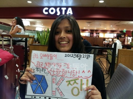 영국 소녀 사하라가 런던 히스로공항에서 한글 피켓을 들고 환하게 웃고 있다. 런던|전영희 기자