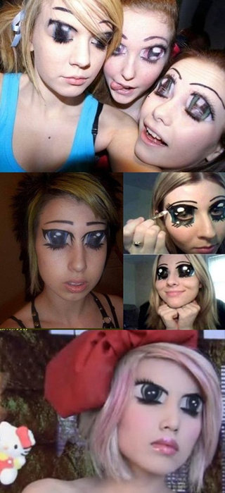 사진은 미국 여성들의 화장한 모습을 담고 있는데, 미국의 유행 화장법이라는 것이 만화 주인공 처럼 얼굴의 절반에 눈을 그려 넣은 것. 일명 ‘만찢녀(만화를 찍고 나온 여자)’ 로 변신하는 것을 말한다.