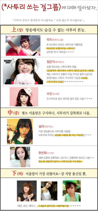 게시물에는 사투리 쓰는 걸그룹 멤버들을 상중하로 분류해 사진과 그 이유에 대해 나열해 놨다. 애프터 스쿨 리지, 에이핑크 정은지, 에프엑스 설리 등이 등장한다.