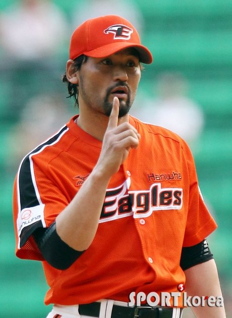 1일 저녁 서울 잠실야구장에서 열린 `2012 팔도 프로야구` LG트윈스와 한화이글스의 경기에서 한화 박찬호가 포수 신경현과 사인을 교환하고 있다.