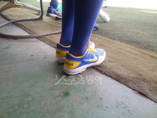 삼성의 주전 1번타자 자리를 굳힌 정형식(21)은 최근 팀 내서 가장 ‘핫’한 선수다. 1일 대구 두산전을 앞두고 삼성 덕아웃에서 그는 신고 있던 스파이크 때문에 또 한번 ‘핫’한 선수가 됐다. 그는 31일 훈련 때부터 파란색과 노란색이 조화된 스파이크를 신고 나타났다. 이는 ID서비스(운동화를 구매자가 원하는 색상, 문구 등으로 꾸밀 수 있는 서비스)를 통해 그가 직접 구입한 스파이크였다.(사진) 스파이크 위쪽 부분에는 그의 등번호를 뜻하는 ‘59’가 새겨졌으며 발뒤꿈치에는 정형식의 이름이 영문으로 새겨졌다. 정형식만을 위한 스파이크인 셈이다.