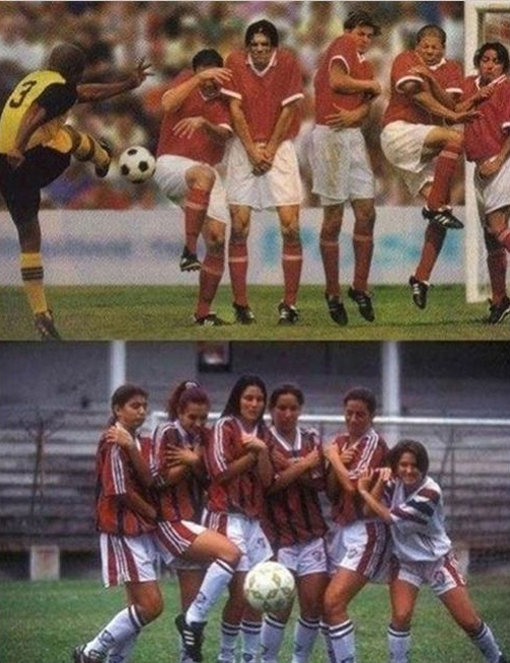 먼저 남자 축구선수들은 공이 날아 오자 남성의 중심부를 손으로 가렸다. 반면, 여자 축구선수들은 가슴부위에 양 손을 얹고 몸을 웅크렸다.