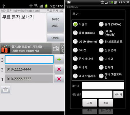 하지만 ‘라이트 SMS(Light SMS. 개발자 강병욱)’라는 앱을 이용하면 이러한 번거로움 없이 위 업체들의 무료 문자 서비스를 편하게 이용할 수 있다. 라이트 SMS는 각 업체의 홈페이지에 접속할 필요 없이 앱 내부에서 사이트 로그인과 문자 전송의 과정이 이루어지기 때문이다. 따라서 사용자는 앱을 가동해 일반 문자를 보내듯 전화번호와 글자를 찍어 ‘보내기’만 누르면 된다.