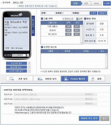 문자를 홍보수단으로 이용하고자 하는 기업들은 짧은 문자만으로 이루어진 SMS보다는 이미지까지 첨부할 수 있는 MMS를 되도록 많이 이용하고 싶어한다. 하지만 문제는 역시 비용이다. MMS는 SMS에 비해 몇 배나 많은 요금이 들기 때문이다. 하지만 반대로, SMS 전송 비용을 들여서 MMS와 유사한 효과를 볼 수 있다면 참으로 매력적일 것이다. 기업 사용자들 대상의 대량 문자 전송 솔루션 업체인 넥스티아의 ‘메세지미(www.messageme.co.kr)’는 대량 문자를 저렴하고 효과적으로 보낼 수 있는 몇몇 기능을 가지고 있는데, 그 중에도 가장 눈에 띄는 것이 바로 ‘픽쳐 메시지’ 기능이다.