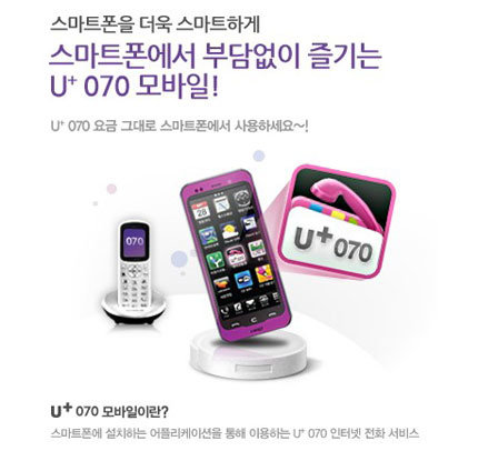 특히 LG유플러스에서는 가입자에 한해 전용 앱을 설치해 스마트폰을 인터넷전화처럼 이용할 수 있는 ‘070 모바일’ 서비스를 운영하고 있다. 이를 이용하면 단말기는 스마트폰을 이용하면서 음성 및 문자 요금은 인터넷전화 수준으로 낮출 수 있는 것이 장점이다.