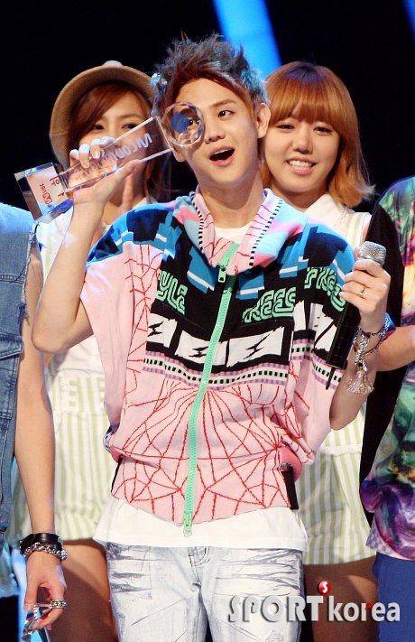 비스트가 2일 오후 서울 상암동 CJ E&M 센터에서 열린 `Mnet 엠카운트다운(엠카)`에 컴백후 첫 1위를 차지한 뒤 트로피를 눈에 대고 있다.