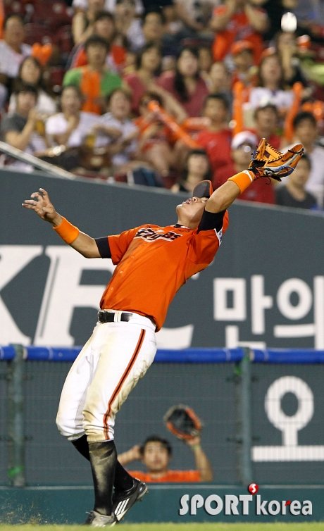 2일 저녁 서울 잠실야구장에서 열린 `2012 팔도 프로야구` LG트윈스와 한화이글스의 경기 5회말 1사 1루에서 한화 3루수 오선진이 LG 윤정우의 플라이을 아웃시키고 있다.