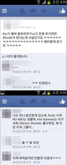 이에 누리꾼들은 “공대생이 보는 f(x)의 수준”,“당신들을 이과 그룹으로 인정합니다”,“재치있고 재미있네요” 등의 반응을 보였다.