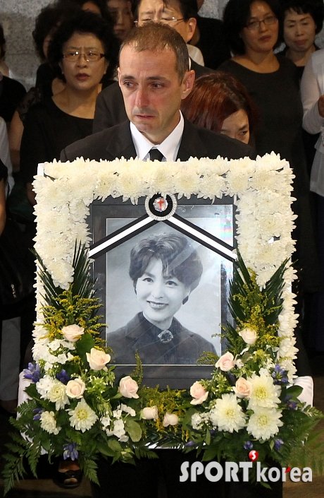 3일 오전 서울 여의도 성모병원 장례식장에서 진행된 故 남윤정의 발인식에서 고인의 사위 Joseph이 영정 사진을 든 채 눈물을 흘리고 있다.