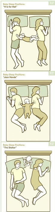 그리고 이어지는 사진에는 아이의 잠버릇을 담고 있다. 첫째‘H is for Hell(지옥같은 H자세)’이라고 적힌 사진은 나란히 누운 부모 사이에 가로로 잠든 모습이 담겼다.