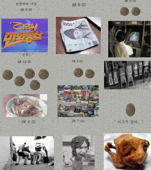 일요일 아침 8시에 ‘디즈니 만화동산’을 시청하고 천원을 들고 집을 나선다. 이어 오전 10시에는 오락실에서 200원으로 게임을 한 뒤 12시에는 500원짜리 떡볶이를 먹는다.