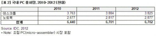 시장조사업체 IDC에 따르면, 2012년 1분기 국내 전체 PC 출하량은 193만 대로 전년 동기 206만 대 대비 6% 감소한 것으로 나타났다. 2012년 전체 판매 예상 수치는 670만 대로 작년 수준에 머물 것으로 예측됐다. 매년 200~300만 대씩 증가해오던 국내 전체 PC 출하량에 제동이 걸린 셈. 작년 수준과 비슷할 것이라는 예상도 불분명하다. 하반기 인텔 3세대 코어 프로세서(아이비브릿지)의 출시와 SSD 가격 하락으로 인한 노트북 구매 수요 증가와 디아블로3 등 대작 게임 출시로 인한 가정 및 PC방의 데스크탑PC 교체가 이루어졌을 경우에나 가능한 수치다.