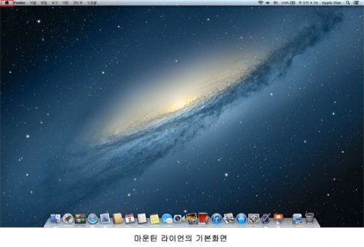 모든 설정을 마치면 마운틴 라이언의 기본화면이 뜬다. 화면 왼쪽 상단의 애플 로고를 누르면 시스템 종료, 재시동, 애플리케이션 강제 종료, 시스템 환경설정(제어판), 소프트웨어 업데이트 등 맥북의 기본 기능을 제어하기 위한 메뉴가 뜬다. 화면 상단의 다른 메뉴들은 실행중인 앱에 따라 변하지만, 애플 로고는 어떤 애플리케이션(이하 앱)을 실행하던 간에 고정적으로 유지된다. 윈도의 ‘시작’ 버튼과 유사한 기능을 갖춘 셈이다.