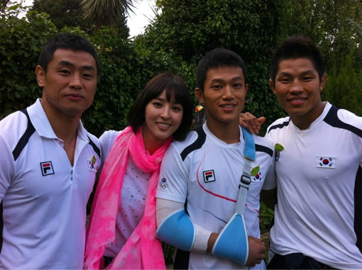 공개된 사진에는 한혜진을 비롯해 김재범, 송대남, 조준호의 모습이 담겨 있다. 특히 유도 메달리스트 사이서 환하게 미소 짓는 한혜진의 모습이 눈에 띈다.