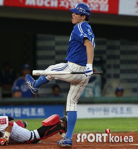 `2012 팔도 프로야구` 롯데 자이언츠와 삼성 라이온즈의 경기가 3일 오후 부산 사직야구장에서 열렸다. 2회초 1사 1루에서 삼성 정형식이 롯데 선발 고원준의 투구를 다리를 맞고 고통스러워하고 있다.